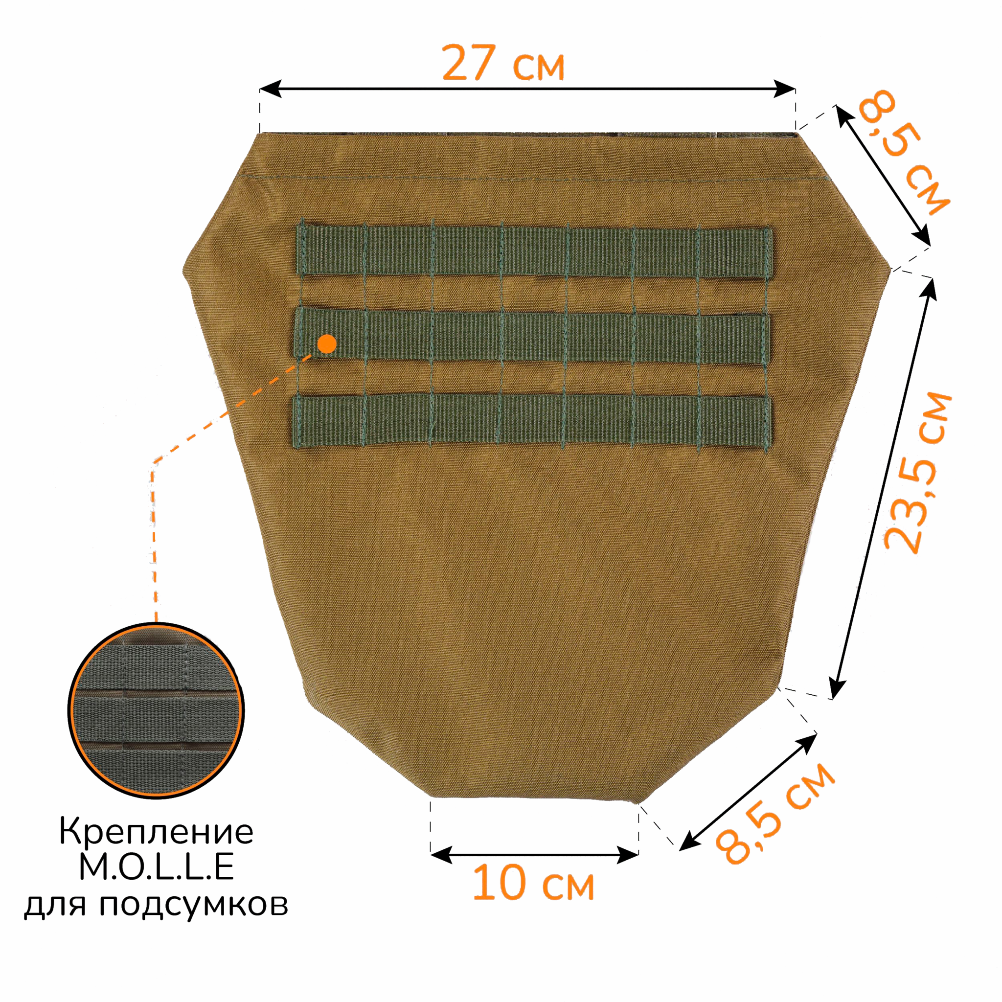 - На внешней стороне нашиты ячейки MOLLE , позволяющие дополнительно установить малогабаритное снаряжение.