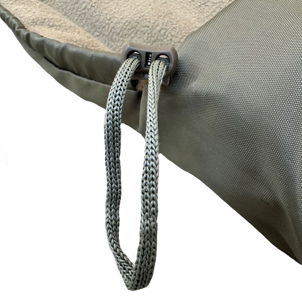 - Козырек подголовника и горловина мешка оборудованы стягивающим шнуром - кулиской, с помощью которой спальник утягивается вокруг головы и по воротниковой зоне;