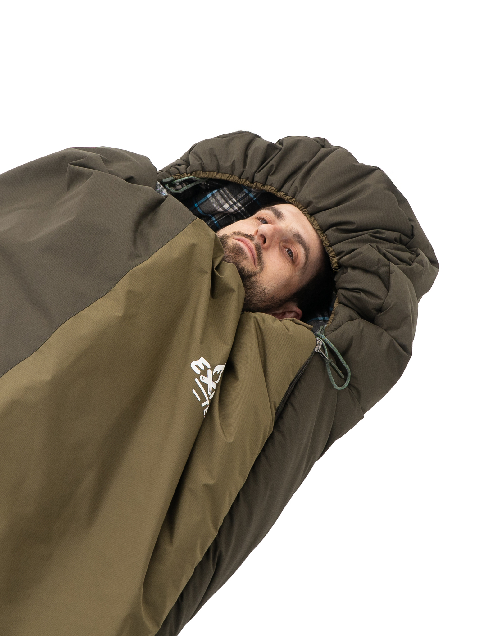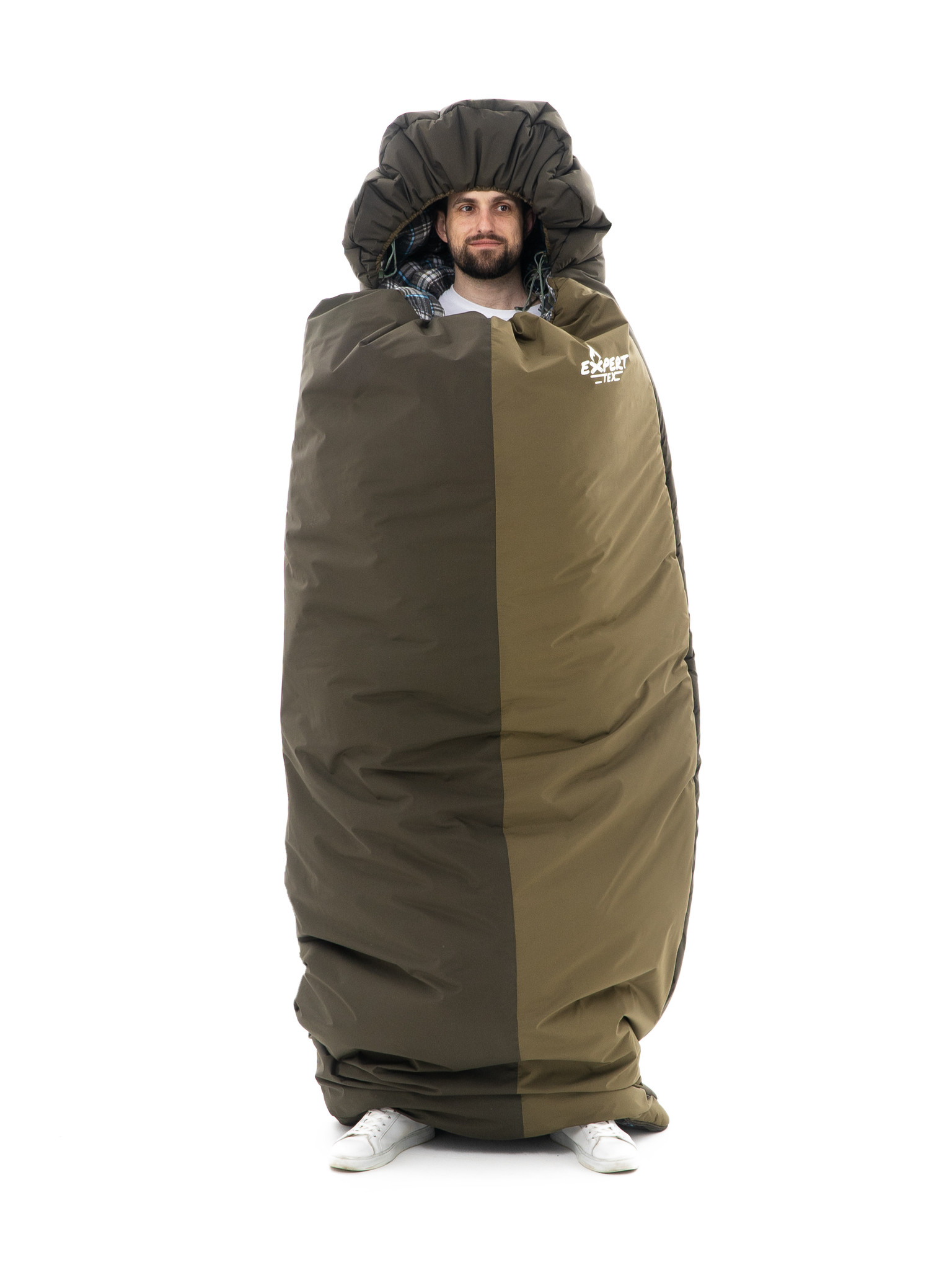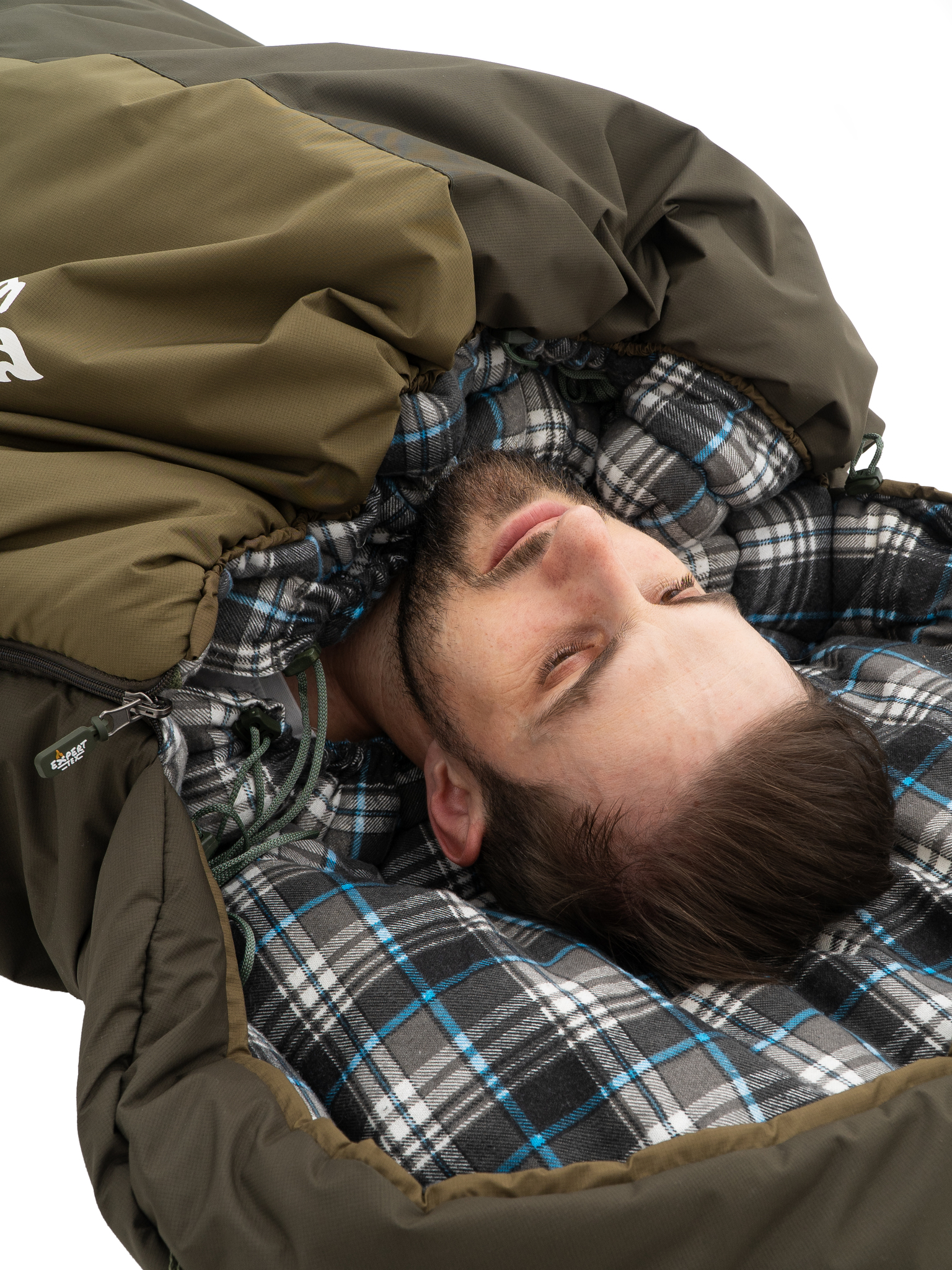 - Подголовник дополнительно снабжен увеличенным козырьком для более плотного стягивания, а сам спальник имеет увеличенные размеры;