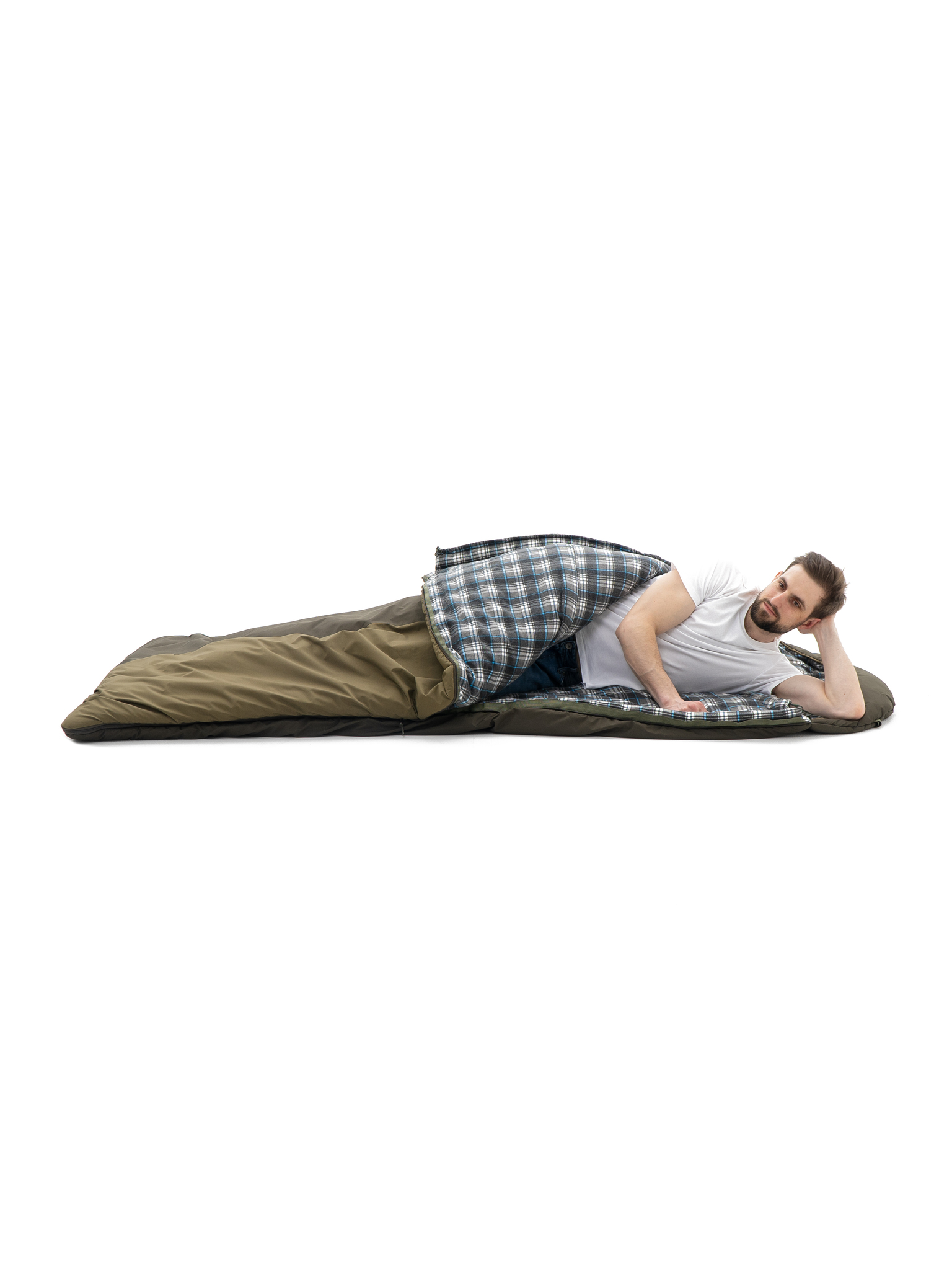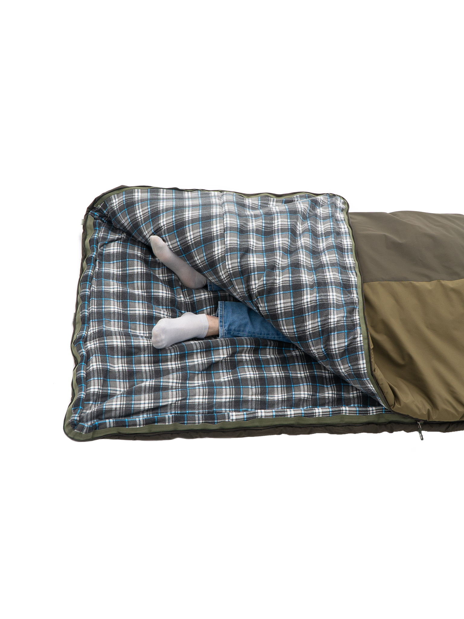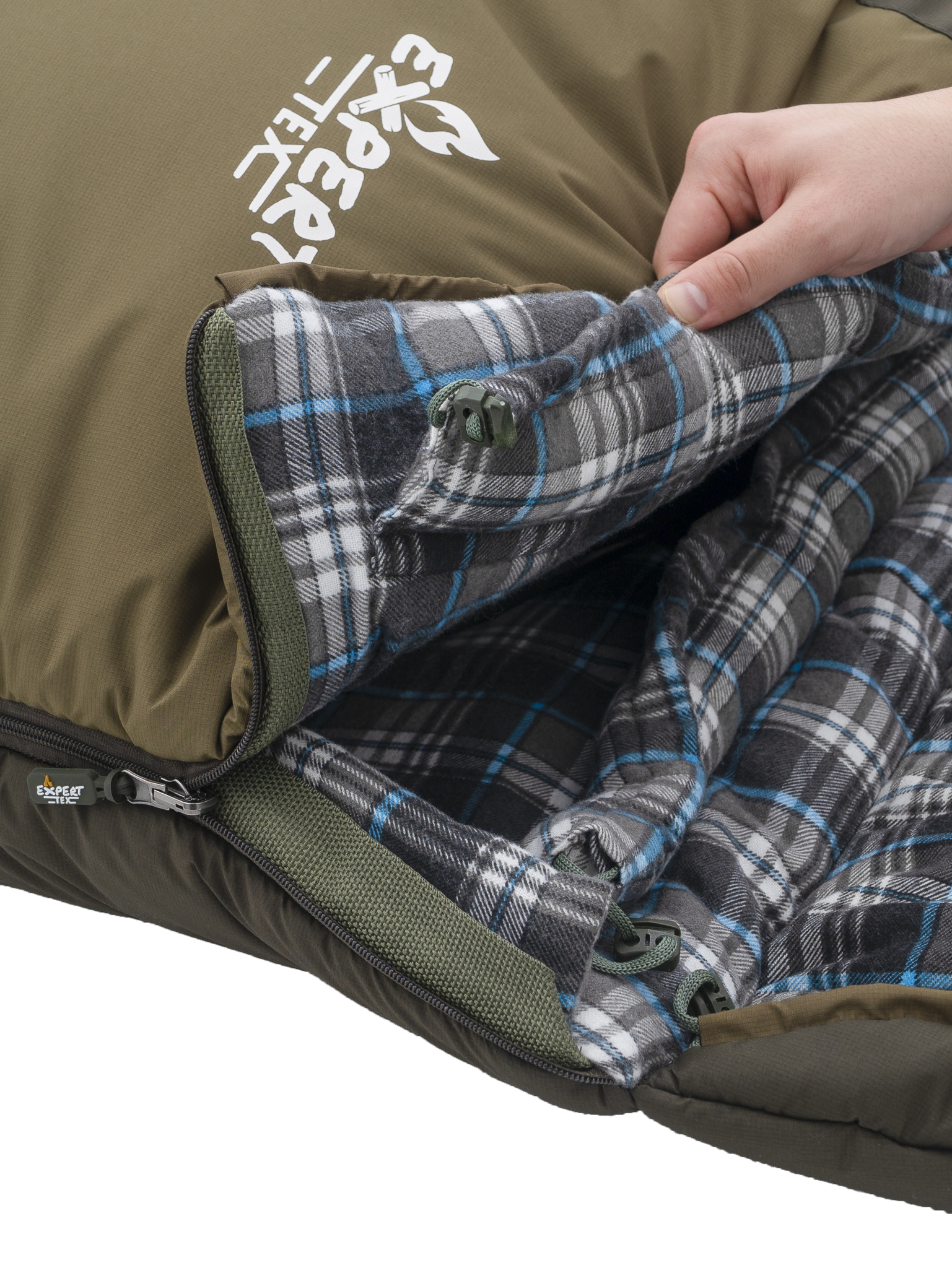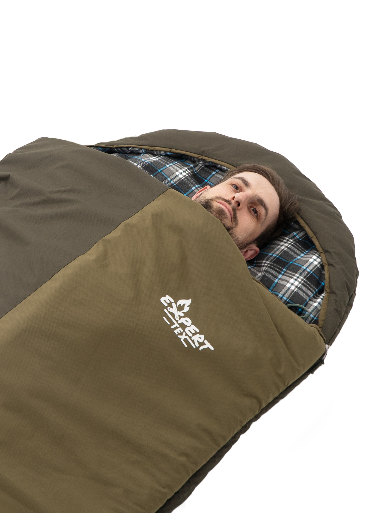 - Подголовник дополнительно снабжен увеличенным козырьком для более плотного стягивания, а сам спальник имеет увеличенные размеры;