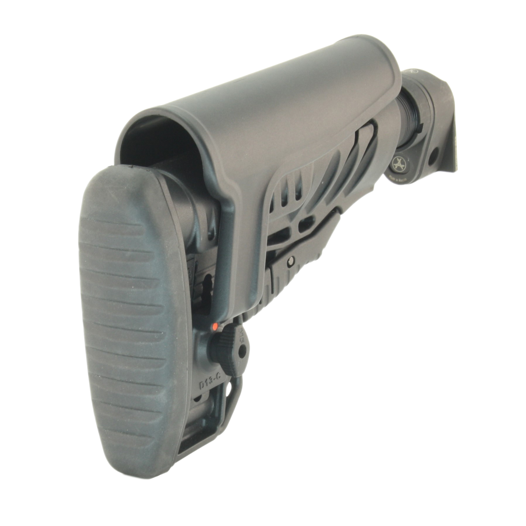 - Агрессивный резиновый протектор на затыльнике не дает комплекту скользить по плечу во время ведения огня, но и не цепляется за амуницию. Слегка закругленная форма обеспечивает удобную быструю вкладку.