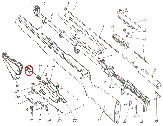 Защелка магазина СКС обладает зацепом для захвата выступа на его крышке и кнопку, при оттягивании которой она высвобождается и открывается. На изделии есть выступающая часть для фиксации пружины шептала.
